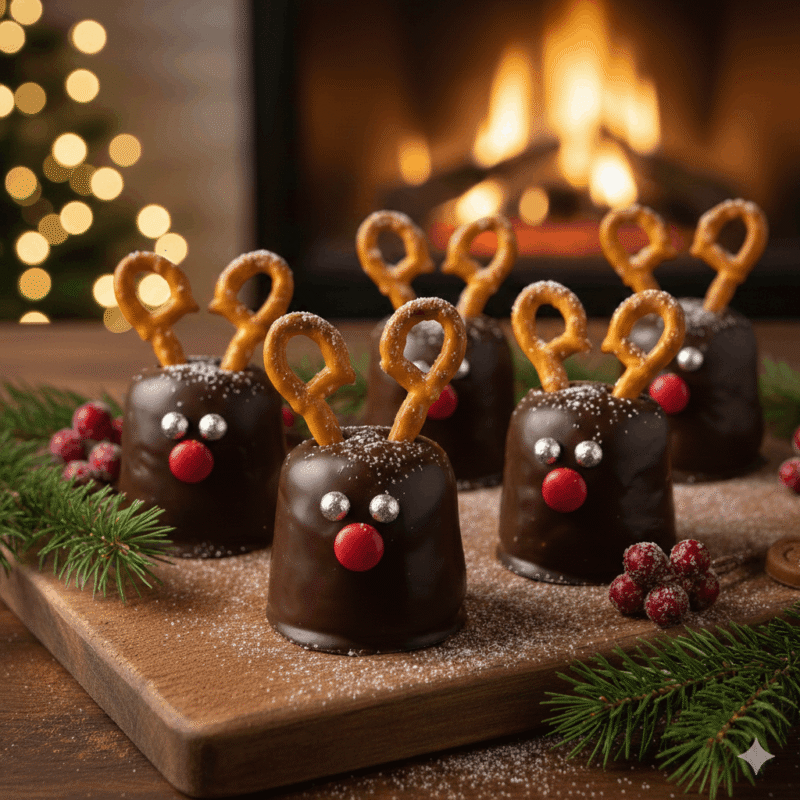 - チョコが固まってきそうになったら、プレッツェル、アラザン、2で作った鼻をつけたら出来上がり