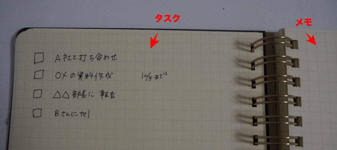 - ノートを半分にして、左側のノートにはタスク(to doリスト)を箇条書きする