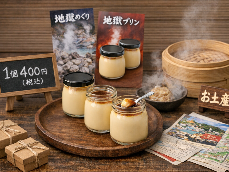 - 温泉の蒸気でプリンを蒸す「地獄蒸し」を取り入れているお店も多い